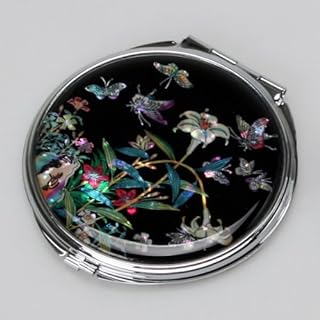 螺鈿細工 2倍率の拡大鏡付き メタル 丸型 花柄(ユリ) 両面コンパクトミラー【ブラック】