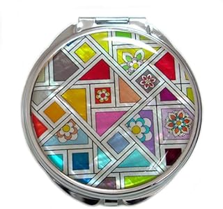 螺鈿細工 2倍率の拡大鏡付き メタル 丸型 カラフルなパッチワーク風 両面コンパクトミラー