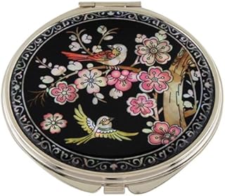 螺鈿細工 2倍率の拡大鏡付き メタル 丸型 花柄 両面コンパクトミラー【ブラック】