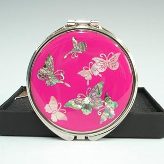 螺鈿細工 2倍率の拡大鏡付き メタル 丸型 蝶々柄 両面コンパクトミラー【ピンク】