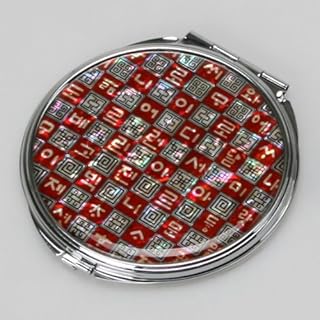 螺鈿細工 2倍率の拡大鏡付き メタル 丸型 ハングル文字 両面コンパクトミラー【レッド・赤】