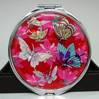 螺鈿細工 2倍率の拡大鏡付き メタル 丸型 蝶々柄 両面コンパクトミラー【レッド・赤色】