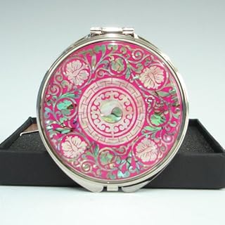 螺鈿細工 2倍率の拡大鏡付き メタル 丸型 陰陽マーク 花柄 両面コンパクトミラー【ピンク】