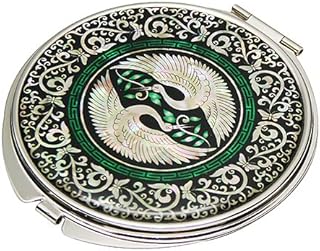 螺鈿細工 2倍率の拡大鏡付き メタル 丸型 鶴 両面コンパクトミラー【ブラック】